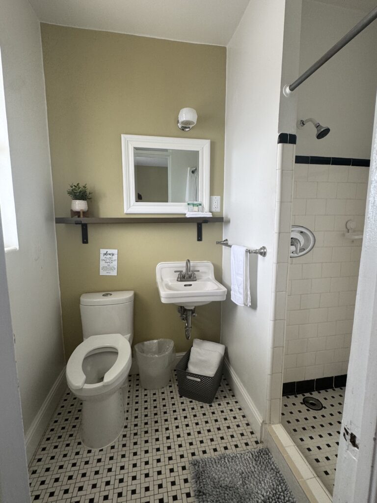The room was great, it smelled like peppermint when we walked in! It’s decorated nicely, very clean and we felt very safe. I absolutely love the older details they kept like the bathroom light and shower tiles. You can tell the upgrades theyve put in are quality. Lovely sink, toilet, tv, mattress, fridge..even the sheets were cute!